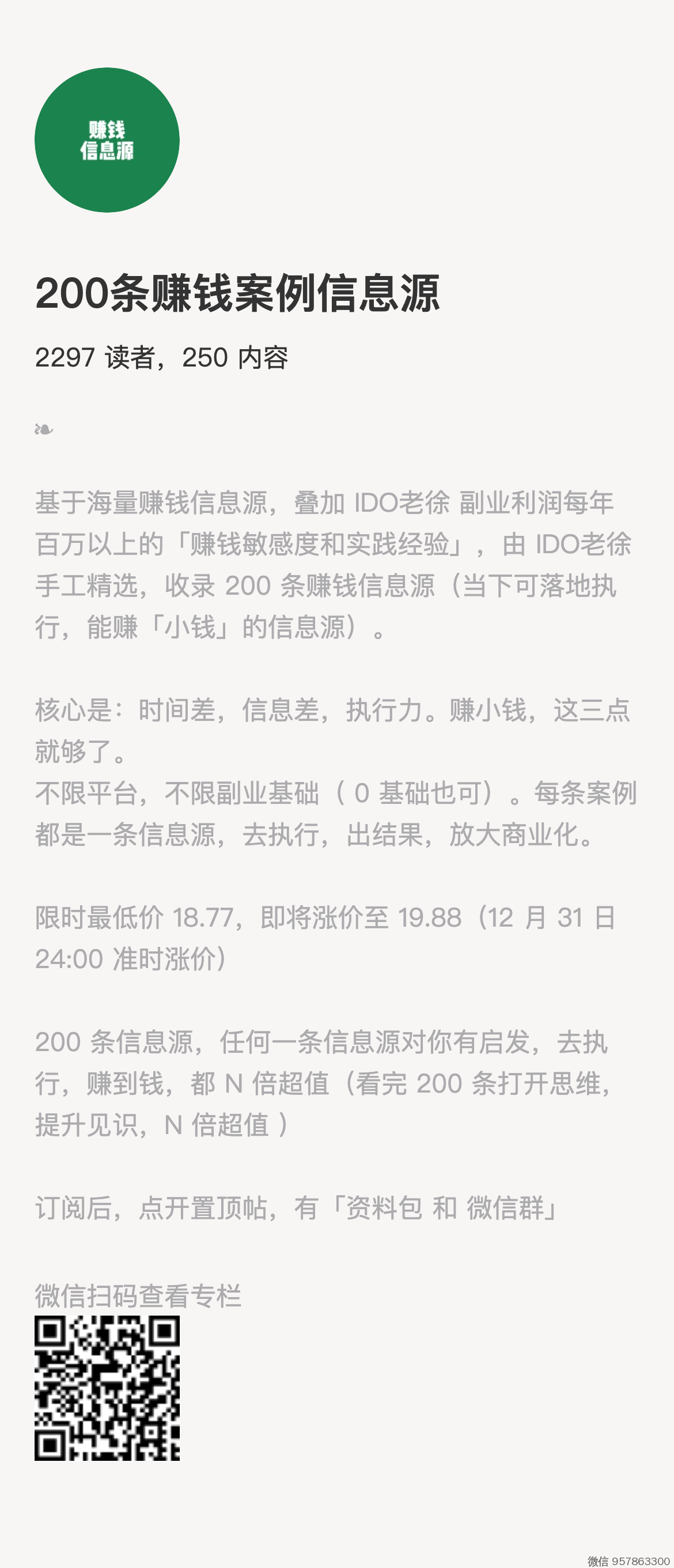 1、如上微信扫码订阅,截图支付记录,微信 957863300 找我,送你一份「从素人到IP的可复制路径」原创资料(以及老徐过往 10 年的原创资料包)